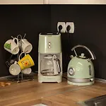 يمكن للضيوف الوصول إلى خيارات الخدمة الذاتية مثل الغلاية الكهربائية وماكينة القهوة والشاي والآنية الزجاجية في المطبخ المجهز.